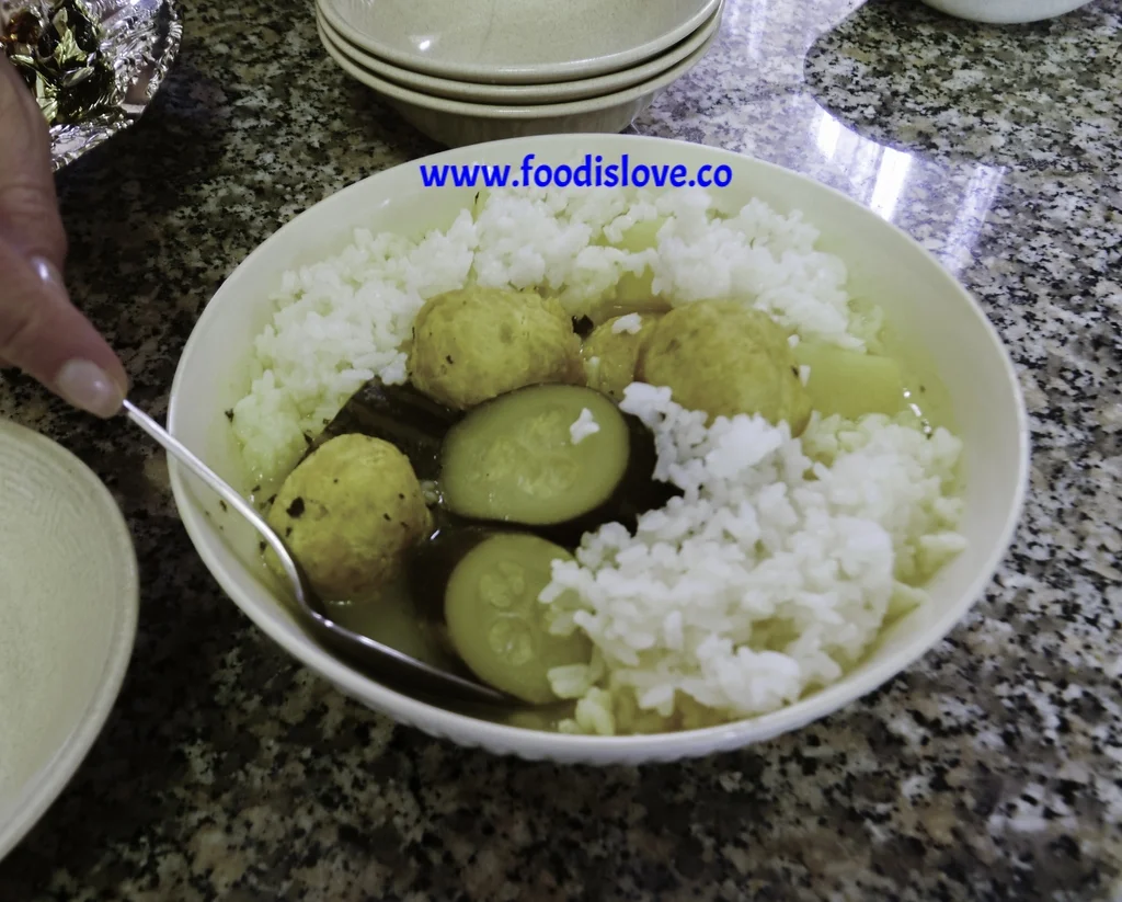 To serve: put rice in each bowl, then add veges and chicken balls and ladle soup on top.