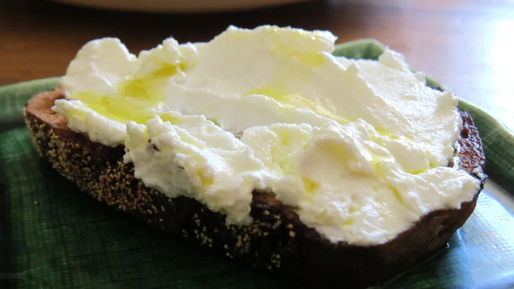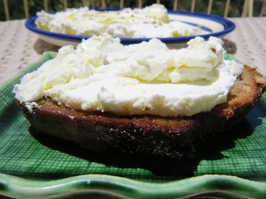 Home-made labne, on walnut bread. Recipe below